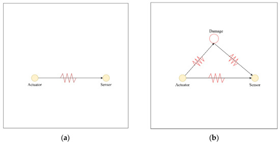 As illustrated in Figure 2, when the structure is undamaged, the wave travels directly from actuator to receiver. When damage is present, part of the wave is scattered at the damage site and reflected toward the receiver, generating additional signal components. Assuming that other variables remain constant, the damage scattering signal can be obtained by baseline subtraction: