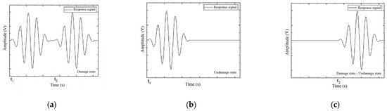 Damage scattering signal acquisition is obtained by (a) damaged response signal minus (b) undamaged response signal, as shown in (c) damage scattering signal.