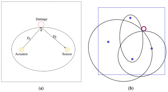 Since both vg and tidj are constants, it can be concluded that the result, Didj, is also a constant. Therefore, the damage reflection point is located on an ellipse with the actuator and sensor as the foci and the distance between the actuator and sensor, Didj, as the major axis, as shown in Figure 4a. Since vg is a constant, the distance from the actuator to the damage reflection point, Di + Dj, is the shortest distance, meaning the signal reflected from the damage point is the first to be received by the sensor. Therefore, the first arrival signal in the damage scattering signal is the signal reflected by the damage reflection point. The propagation time can be calculated based on the time difference between the start of the damage scattering signal and the excitation signal, as shown below: