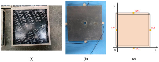 The specimen numbers S0, S20, and S30 represent the healthy state, damage with a 20 mm diameter, and damage with a 30 mm diameter, respectively. L1, L2, and L3 represent the damage center positions at (150 mm, 150 mm), (205 mm, 205 mm), and (205 mm, 150 mm), with the coordinate axes originating from the bottom-left corner of the specimen, as shown in Figure 5c. The smart aggregates (SA) were attached at the center of each of the four edges.