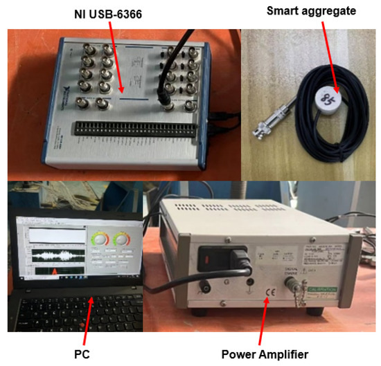 The experimental setup includes Smart Aggregates (SA), signal amplifiers, NI USB-6366 data acquisition cards, and computers, as shown in Figure 6. The SA used were produced by Qinhuangdao Hengke Technology Co., Ltd. (Qinhuangdao, China). The NI USB-6366 data acquisition card, made by National Instruments (NI, Austin, TX, USA), is a synchronous sampling multifunctional data acquisition device with 8 input channels and a maximum sampling rate of 2 MS/s. By combining the NI USB-6366 with LabVIEW 2023, specific signal forms can be generated, and signal reception can be achieved.