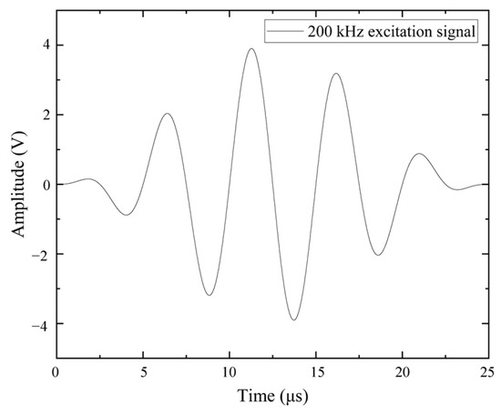 Generally, the higher the frequency of the detected signal, the better the spatial resolution. However, this also leads to greater attenuation. Considering that the specimens in this experiment are relatively small, to achieve better spatial resolution, a Gaussian-modulated sine wave signal with a central frequency of 200 kHz was selected as the excitation signal. The specific expression is given by Equation (9), with an amplitude of 4 V and a central frequency, f, of 200 kHz. The waveform is shown in Figure 7. The sampling frequency during the experiment was 1 MS/s.