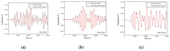 The signal used in this experiment is a Gaussian-modulated sine wave with a central frequency of 200 kHz. The time delay of the Gaussian-modulated signal is 1.8 μs. The S0 specimen was used for wave speed analysis, as it represents a healthy state concrete specimen, meaning that the stress wave propagation is not affected by any damage. The actuator SA1 and the remaining three sensors were used as receivers for wave propagation analysis. The center-to-center distances from the actuator SA1 to the receivers SA2, SA3, and SA4 were 212 mm, 300 mm, and 212 mm, respectively. By collecting the voltage changes at the receivers SA2, SA3, and SA4, the time-domain voltage signals of the sensors were obtained. The voltage response signals were denoised using a three-level wavelet transform, as shown in Figure 8.