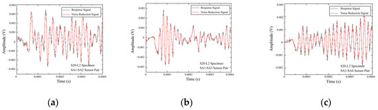 Response signals for specimen S0 of (a) SA1-SA2, (b) SA1-SA3, and (c) SA1-SA4 sensor pairs.