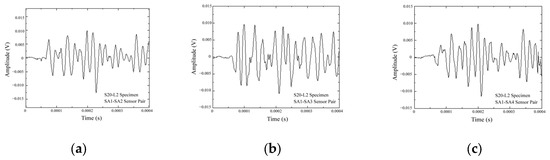 Response signals for specimen S20-L2 of (a) SA1-SA2, (b) SA1-SA3, and (c) SA1-SA4 sensor pairs.