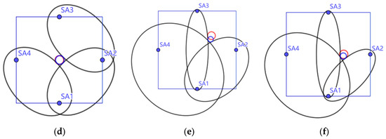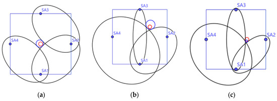 For concrete damage, circular damage can encompass most damage types. By determining three different boundary reflection points, a circle can be established to localize concrete hole damage. SA can serve as both actuators and receivers. Therefore, only three SA are needed to identify and localize damage. However, when the damage is located along the line connecting two sensors, there is a significant error when applying the damage scattering signal-based method for concrete damage localization, and a boundary reflection point cannot be determined. To ensure accurate localization of concrete hole damage, four SA are arranged. Three different ellipses are obtained from the first wave arrival times of three sets of damage scattering signals and the stress wave speed, and the outer circle of the three ellipses is determined to localize the damage. Once enough reflection points are determined, the basic outline of the damage can be established, enabling localization and quantification of the damage, as shown in Figure 4b.