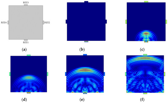 The model dimensions and piezoelectric arrangement are shown in Figure 13a. Stress wave propagation in the concrete slab under healthy conditions is analyzed and studied, as shown in Figure 13b. At the starting moment, an electric field is applied to the piezoelectric ceramic, causing it to deform due to the inverse piezoelectric effect. The concrete slab generates stress waves under the excitation, which propagate in a spherical shape within the concrete medium. As shown in Figure 13c, at a certain time t = 26 μs, the stress wave clearly exhibits spherical propagation. The stress waves in the vertical polarization direction are shown in red, while the waves on either side are in lighter colors, indicating that the energy in the vertical direction is larger. At a later time (t = 42 μs), as shown in Figure 13d, the stress wave propagates to the boundary, where reflection occurs. The reflected wave and the original stress wave partially cancel each other out, resulting in a decrease in the intensity of the original stress wave. As shown in Figure 13e, at time t = 58 μs, the first wave of the stress wave reaches PZT2 and PZT4, meaning that the stress wave signal is received by the PZT sensors. Simultaneously, the color of the piezoelectric ceramics gradually darkens, and they undergo strain. Due to the direct piezoelectric effect, an electrical effect is generated on the SA, which leads to a voltage signal change that is collected. At a later time (t = 82 μs), as shown in Figure 13f, the first wave of the stress wave reaches PZT3, and the stress wave signal is received by PZT3.