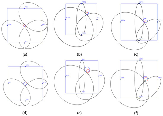 Based on the wave speed and the first arrival time of the damage scattering signal, as well as the positional relationships between the sensor pairs, an ellipse can be obtained, and one boundary point of the damage will lie on this ellipse. A circle can encompass most shapes, and when three boundary points of a circle are found, the shape can be determined. Therefore, to locate the damage, three different ellipses need to be obtained, and the outer circle of these three ellipses will provide an approximation of the damage location. Based on the principles of the damage localization method described earlier, damage localization was analyzed for each specimen, and the results are shown in Figure 11.