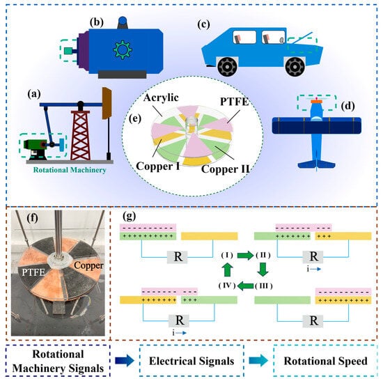 The application scenarios, structural details, and the principle of rotational speed prediction using the TENG are shown in Figure 1. Rotating structures are widely present in machinery such as oil drilling platforms, aircraft, and vehicles (see Figure 1a–d). In these applications, the real-time monitoring of rotational speed is often necessary. Rotational machinery typically generates vibrations during operation, which can reduce the sensitivity and lifespan of traditional speed sensors. Moreover, conventional sensors tend to have complex structures and large sizes, making installation difficult and increasing costs. Therefore, this paper proposes a TENG-based device for speed measurement, shown in Figure 1e, which features high sensitivity, a simple structure, and compact size. The TENG is composed of acrylic plates, polytetrafluoroethylene (PTFE), and copper films, with the adjacent copper films represented as green and yellow for clarity in the explanation of the working principle.