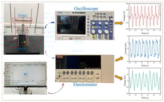 To stimulate the TENG to generate voltage signals, a data collection platform was constructed. As shown in Figure 2, the data acquisition platform mainly consists of the TENG, a PC, an oscilloscope (Hantek DSO5102P, Hantek Electronics, Qingdao, China), and an electrometer (Keithley 6514, Keithley Instruments, Cleveland, OH, USA). First, two acrylic plates measuring 30 cm × 30 cm × 0.5 cm were cut. One acrylic plate was placed above the motor and fixed to the bottom porous plate with bolts and nuts. The other plate was also fixed to the lower acrylic plate with bolts and nuts, serving to secure the stator of the disk-shaped TENG. The motor was positioned between the porous plate and the acrylic plate to provide excitation for the disk-shaped TENG. Two acrylic plates, each with a diameter of 18 cm and a thickness of 0.5 cm, were cut to serve as the base of the disk-shaped TENG, with a small hole of 14 mm diameter left at the center of the base. The friction materials of the TENG were copper and PTFE films. A circular copper film with a diameter of 16.6 cm and a thickness of 50 µm was divided into eight equal parts and evenly adhered to the base, serving as the stator of the disk-shaped TENG. Two wires connected four sections of the copper film to create the two output electrodes. Four PTFE films of the same thickness and size were adhered to equally sized foam boards, which were then evenly spaced and attached to another acrylic base, serving as the rotor of the disk-shaped TENG. Two flange seats connected the linear optical shaft to the motor shaft, allowing the linear optical shaft to pass through the small hole of the disk-shaped TENG, with the flange seat securing the rotor and linear optical shaft. By adjusting the motor to generate different rotational speeds, varying outputs from the disk-shaped TENG were produced. A digital oscilloscope was used to collect the output voltage signals. The electrometer was controlled via a PC to gather short-circuit current and transferred charge data. At maximum speed, different resistors were connected to measure peak current, allowing for the calculation of peak power.
