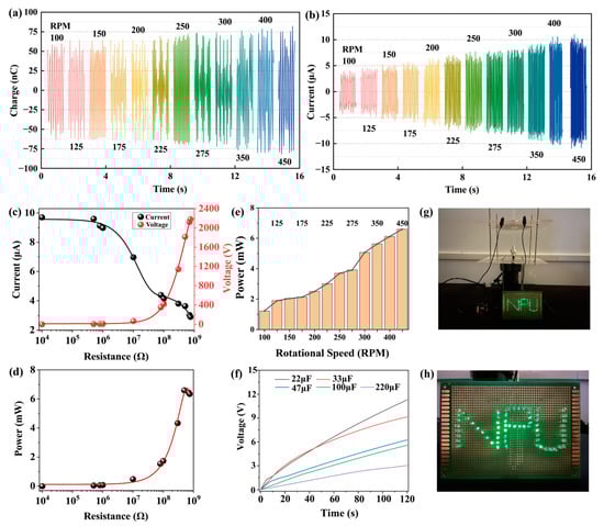 The output and application of TENG. (a) Quantity of charge transferred by TENG at various rotational speeds. (b) Short-circuit current of TENG at different rotational speeds. (c) Short-circuit current and output voltage under different load resistances. (d) Power under varying load resistances. (e) Peak power at different rotational speeds. (f) Voltage curves for TENG charging capacitors of varying sizes. (g,h) TENG illuminating LED lights.