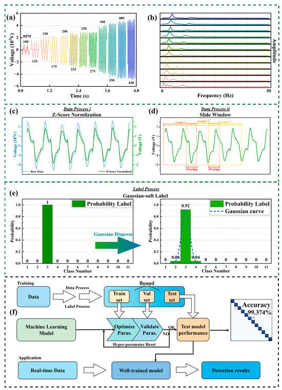Data processing and machine learning flow chart. (a) Raw voltage signals collected by the TENG at different rotational speeds. (b) The frequency domain information is presented after performing a Fourier transform on 128-length segments of the original data at each speed. From top to bottom, the rotational speeds are 450 to 100 rpm, corresponding to Figure (a). (c,d) Data processing procedure. First, the experimental raw data are collected, followed by normalization. Finally, the data are segmented into equal lengths using a sliding window. (e) Schematic illustration of the operation details of the Gaussian soft label. (f) Machine learning flow chart. The upper part is the model training process. The lower part is the actual application process of the test.