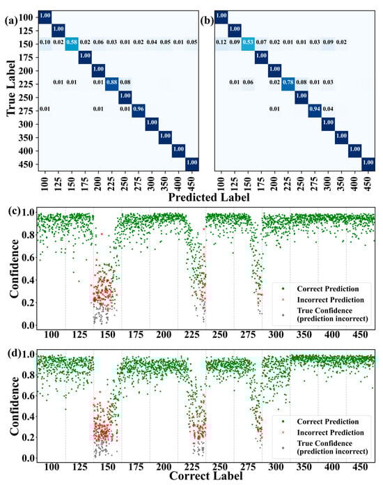The classification and prediction results of LSTM for different rotational speeds with One-Hot and Gaussian soft encoding for labels are shown in Figure 5a,b. The LSTM results are slightly better than those of the MLP, although the classification at 150 rpm and 225 rpm remains worse than at other speeds. This indicates that the quality of raw data has a significant impact, and noise in the data collection process can influence the results. Therefore, the accuracy changes and stability improvements of the three algorithms after normalization were compared. In these tests, the input data length for all three algorithms was set to 512. To explain the results more clearly, we present a scatter plot to visualize the model predictions and actual rotation speeds (as shown in Figure 5c,d). The horizontal axis represents the index of the sample, with a total of 12 categories. The vertical axis represents the confidence of the prediction. The green points represent samples that are predicted correctly. The red crosses and gray points represent samples that are predicted incorrectly and the confidence of their true categories. The vertical dotted lines are used to separate different categories, and the labels at the bottom indicate the values corresponding to each category. As shown in Figure 5c, when the rotational speed is 150 rpm, there are more red points, and the prediction effect is poor. The corresponding accuracy is 0.58. A small number of red points also appear at 225 and 275 rpm, and the corresponding accuracy is 0.88 and 0.96, respectively. When the prediction is incorrect, the corresponding gray point distribution of the correct confidence is very close to the red points. Similarly, for Gaussian labels, it is also obvious that the speed is worse at 150 and 225 rpm. This also shows that there is a certain systematic error in the experimental process, which affects the results. Additionally, we evaluated the PR and F1 score curves of the LSTM model under different configurations, and the results are shown in Figure S5.