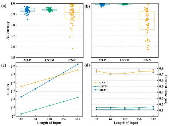 To intuitively compare the three algorithms, the computational cost variations with different training data lengths were statistically analyzed. Floating point operations (FLOPs) are mainly used to measure a model’s computational complexity, i.e., the amount of computation needed for inference or training. As shown in Figure 6c, the horizontal axis represents the data input length increasing from 32 to 512, with blue data points indicating the FLOPs for the MLP as the data length increases. We observe that the overall trend is linear growth. In comparison, the orange CNN data points show that initially, MLP’s computational cost is lower than the CNN’s, but as the input data length increases, MLP’s computational cost also increases, eventually surpassing the CNN’s slope. However, regardless of slope or values, the green LSTM data points show significantly lower computational costs than the other two algorithms. Figure 6d shows the comparison of computation times for the models under different data lengths. Although the computation time for all three algorithms remains relatively stable with changes in data input length, the computation time for the MLP and LSTM is significantly shorter than that of the CNN.