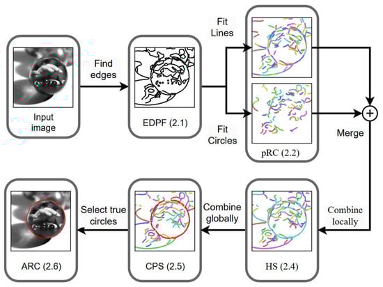 The flowchart of the algorithm is illustrated in Figure 1. For the input image, we first employed the EDPF to extract edge points. Subsequently, the pRC algorithm was applied to extract line segments and circular arcs as preliminary structural elements. The HS algorithm was then utilized to integrate adjacent structural elements into candidate circles. This was followed by the CPS to globally combine and optimize circle parameters. Finally, true circle parameters were obtained through arc length ratio criteria (ARC).