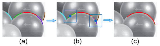In line 4, the function was implemented to identify potential candidate segments for combination by examining square regions that extended beyond both endpoints of within . The square regions possess a fixed side length of , with their positions determined through the following protocol: for segments unbounded with circular parameters, linear extension was implemented by extending outward along the linear trajectory by . For circular-parameter-bounded segments, extension was performed along the arc length by . Segments were identified as candidates when any of their constituent points fell within the corresponding square region. The illustration is shown in Figure 2a image with the identified arcs; Figure 2b extend the central arc (red) with its parameter in both directions by a distance of (yellow dashed lines). The extension points (blue dots) are centers for square search regions (blue squares) of side length . Candidate segments are found within these regions (cyan and green on the left; purple and brown on the right); Figure 2c finally, an optimal combination pattern is sought, merging relevant segments into a unified arc (red, green, and purple combined).