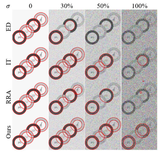 The parameter was the arc completion parameter used during the screening stage to identify true circles. During the circle parameter fitting stage, some local noise instances might be incorrectly combined into circular shapes, though such combinations generally did not form extensive arcs. An appropriately chosen could effectively filter these false positives while preserving valid detections. However, excessively large α values might eliminate genuine circles due to incomplete arc detection or occlusion scenarios. Through empirical observation, we found that when an appropriately sized arc exhibited over 30% completion, humans consistently perceived it as a complete circle. Based on this finding, we set to 0.3 in our implementation.