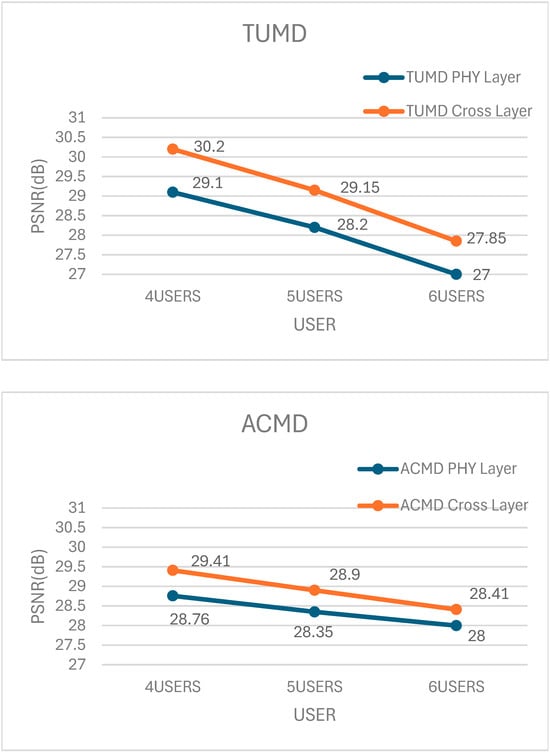The results in Figure 2 represent the outcomes of 10,000 experimental trials. For scenarios with user counts of 4, 5, and 6, the PSNR improvements were as follows: in the TUMD algorithm, an increase of 1.1 to 0.85 dB; in the ACMD algorithm, an enhancement of 0.65 to 0.41 dB; and in the IGLRAM algorithm, a gain of 1.14 to 0.96 dB. It demonstrates the applicability of our proposed cross-layer data stream allocation algorithm to other analog beamforming algorithms as well, not just TUMD in [22].