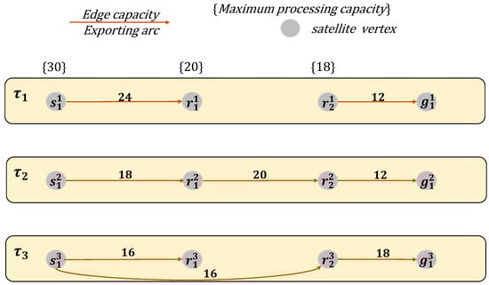 Transmission paths over time slots and satellite processing capacity constraints as represented in the modeled satellite network in Figure 1.