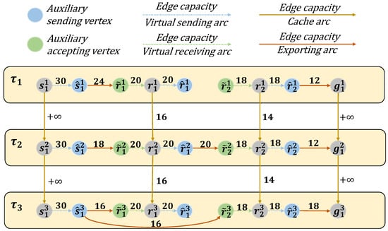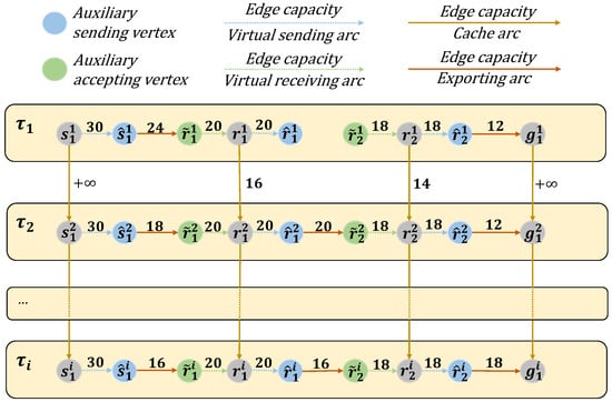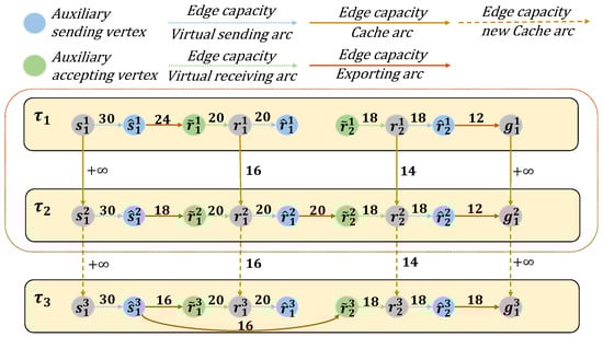 Initially, the e-TEG is constructed based on the network’s state during the first time slot . This initial representation serves as the starting residual network, encapsulating the residual capacities of nodes and edges. As the solving process progresses, the e-TEG is incrementally expanded by incorporating new snapshots of the network corresponding to subsequent time slots . For each time slot , the residual network is updated to reflect the current state of the network, including changes in node and edge capacities.