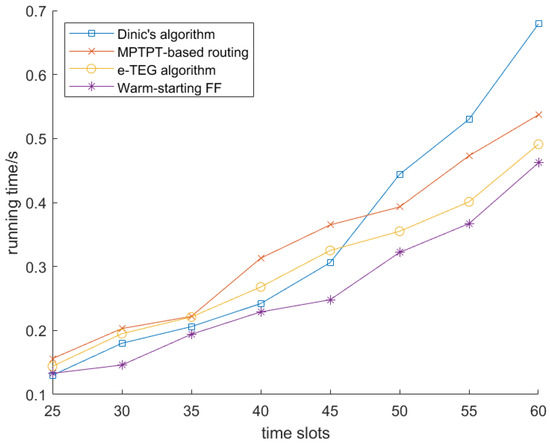 As shown in Figure 6, the running time of all four algorithms increases as the number of time slots rises. However, the proposed warm-starting Ford–Fulkerson algorithm consistently exhibits the smallest running time compared to the other algorithms. This is mainly because the warm-starting Ford–Fulkerson algorithm leverages previously computed flow information from earlier time slots, significantly reducing the time needed for flow calculations in subsequent iterations. In contrast, the e-TEG algorithm performs worse than Dinic’s for a smaller number of time slots because it requires additional overhead to update and maintain the time-expanded graph, leading to longer computation times. However, as the number of time slots increases, e-TEG benefits from its energy constraints and dynamic topology adaptation, allowing it to outperform Dinic’s algorithm in more complex scenarios. We further calculated the acceleration percentage of the warm-starting Ford–Fulkerson algorithm, shown in Table 2, where it reached a peak of 32.24%.