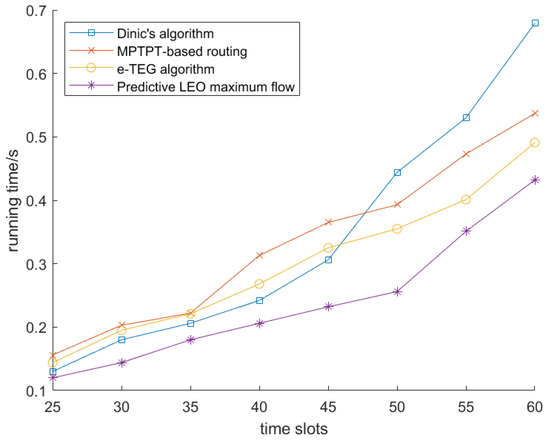 We first analyzed the running time of the warm-starting Ford–Fulkerson algorithm (labeled as “warm-starting FF” in the figures) and the predictive LEO maximum flow algorithm alongside three existing methods in Figure 6 and Figure 7, respectively. For this analysis, we used a satellite network consisting of 25 satellites, each with a limited storage capacity of 600 GB. The running times of the four algorithms were evaluated as the number of time slots varied from 25 to 60.