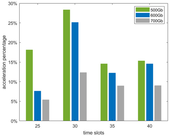 Figure 8 presents the acceleration percentage of predictive LEO maximum flow for different storage configurations (500 GB, 600 GB, and 700 GB) as the number of time slots varies from 25 to 40. As observed in Figure 8, when available storage capacity decreases, the predictive LEO maximum flow algorithm achieves a higher acceleration percentage. This is because lower storage capacity imposes stricter resource constraints, compelling the algorithm to more effectively utilize its predictive capabilities. With less storage available, the algorithm must make better decisions about data flow management, ensuring more efficient use of computational resources while maintaining high flow throughput. This trend suggests that stricter resource constraints incentivize the algorithm to focus on the most efficient flow allocation strategies within the bounded computational budgets, leading to improved performance in terms of both computational efficiency and flow optimization.