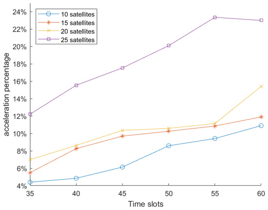 Figure 9 shows the changes in the acceleration percentage of predictive LEO maximum flow as the network scale increases from 10 to 25 satellites. In this evaluation, we fixed the storage limitation on each satellite to 600 GB and varied the number of time slots from 35 to 60. When the network scale increases, the acceleration percentage increases as well, indicating that the predictive LEO maximum flow algorithm becomes more efficient in larger and more complex LEO networks. This is because larger networks provide more opportunities for predictive flow allocation and allow the algorithm to optimize paths across multiple time slots, thereby reducing the overall computational effort. As the number of satellites increases, the algorithm can better adapt to dynamic changes in the network, leveraging its predictive capabilities to efficiently manage larger volumes of data and more complex topologies, leading to an overall improvement in performance.