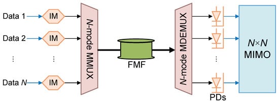 26], the researchers introduced a self-configuration method for the optical MIMO unit to track channel dynamics. The use of multiple in-mesh p-i-n and avalanche photodetectors, along with Mach–Zehnder interferometers, enables signal recovery. Although the optical MIMO scheme offers a reliable solution for mode coupling, its implementation, involving multiple photodetectors and Mach–Zehnder interferometers, is inherently complex.