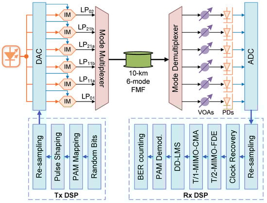Figure 2 illustrates the simulation setup, conducted by using a commercial optical simulation software. The 36 GBaud OOK signals are initially generated by 6 independent random-bit streams and sent for OOK mapping. A pulse-shaping process includes up-sampling to 2 Sa/Sym and passing through a root-raised cosine filter with a roll-off factor of 0.01. The 6-lane optical signals are generated by 6 identical Mach–Zehnder Intensity Modulators and transmitted to the MMUX serving as the signals for the 6 modes. After 10 km 6-mode strong-coupling FMF transmission, the signals from the 6 modes can be obtained by an MDEMUX, attenuated by VOAs, and detected by photodetectors. DAC can capture the 6-lane signals for DSP by an offline MATLAB 2021b program. After resampling to 2 Sa/Sym and clock recovery, the 6-lane signals are processed by T/2-MIMO-FDE, T/1-MIMO-CMA, and independent DD-LMS. After OOK demodulation, the BER can be measured by error counting. In the simulation, the model “LaserCW”, “SplitterPow_1_N”, “ModulatorDiffMZ_DSM”, “CombinerSplitterMM”, “FiberMM”, “CombinerSplitterMM”, “Attenuator”, and “Photodiode” are used to emulate the optical source, optical coupler, Mach–Zehnder Intensity Modulator, MMUX, FMF, MDEMUX, VOA, and photodetector, respectively, where the MMUX, FMF, and MDEMUX are dependent on the module “SolverFiberMeasuredMM”. The “LaserDriver”, “RiseTimeAdjust”, and “DAC” are used to emulate the amplified signals loading to DACs. The “ADC” module is for emulating the ADC. The parameters for these key devices in the simulation are outlined in