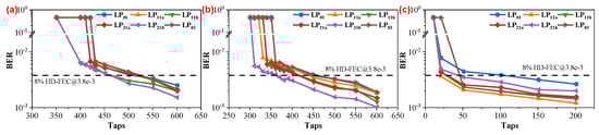 Figure 3 illustrate the relationship between the number of taps and BER performance of T/2-MIMO-FDE under three different “All Modes Correlation Length” values. It is evident that, for all three scenarios, T/2-MIMO-FDE functions effectively for all mode signals when the number of taps exceeds a specific threshold. Furthermore, BER performance gradually improves with an increase in the length of taps. Conversely, when the number of taps falls below a certain threshold, T/2-MIMO-FDE fails to recover signals from certain modes until the number of taps decreases to a smaller value, eventually rendering it incapable of recovering signals from all modes. By comparing