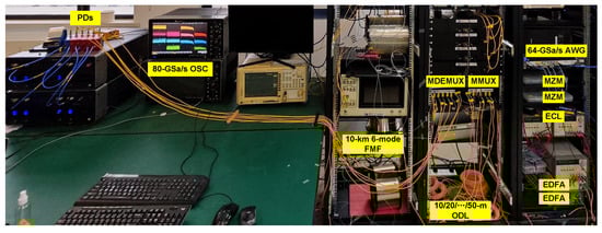 Figure 5c illustrates the system setup. Two independent OOK signals generated from different PRBSs with the method mentioned above are driven by an arbitrary waveform generator (AWG) whose sampling rate is up to 64 GSa/s. The two output streams from the AWG are amplified by two electrical amplifiers (EAs) and sent to two MZMs as intensity modulators with bias on the quadrature point. A 1550 nm continuous-wave light wave with an optical power of 13 dBm is generated by a free-running external cavity laser (ECL) and separated by a polarization-maintaining 1 × 2 optical coupler (PM-OC) and sent into two modulators. Two streams of modulated signals from two modulators are then sent to two identical erbium-doped fiber amplifiers (EDFAs) for amplification. Afterwards, two identical 1 × 4 optical couplers are employed to divide two optical streams into eight paths. Each 1 × 4 optical coupler selectively uses three output paths. In the first 1 × 4 optical coupler, two of the three paths undergo delays of 20 m and 40 m, respectively, while the remaining path has no delay, aimed at signal de-correlation. These three paths are then connected to an MMUX, serving as signals for the LP01, LP11b, and LP21b modes. For the three paths utilized in the second 1 × 4 optical coupler, delays of 10 m, 30 m, and 50 m are applied in comparison to the first path of the initial 1 × 4 optical coupler. Subsequently, these three paths are connected to the MMUX, serving as signals for the LP11a, LP21a, and LP02 modes. The MMUX is connected with the FMF.