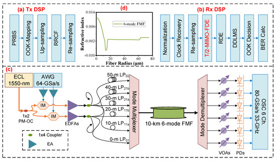 Figure 5a shows the Tx DSP of the six-LP-mode MDM IM/DD transmission system. Firstly, two pseudorandom binary sequences (PRBSs) are generated offline in binary data format. Subsequently, the sequences are mapped to OOK data. Next, in order to restrict the signal bandwidth, the OOK sequences undergo a × 2 up-sampling process to match the requirements of a root-raised cosine filter with a roll-off factor of 0.01. Finally, they are re-sampled into the specific baud rate for generating.