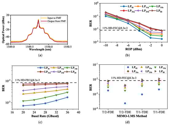 Figure 6b, and it displays the BER performance of the 36 GBaud OOK signal for all LP modes. It is observable that the LP01 mode consistently exhibits superior BER performance compared to other modes. Additionally, within the pairs of degenerate modes, both LP11a and LP21a demonstrate a slightly worse BER compared to their respective degenerate modes. As for the higher-order mode LP02, it exhibits the poorest BER performance. Furthermore, as the ROP increases from −10 to −2 dBm, there is a noticeable improvement in the corresponding BER performance. However, when the ROP reaches 0 dBm, the change in BER performance compared to −2 dBm is relatively minor. We attribute this observation to two primary reasons. Firstly, the PD has reached its saturation in receiving optical power. Secondly, due to the necessity of utilizing a 1 × 4 OC for signal de-multiplexing, which incurs a 6 dB power loss for each output, along with losses in the MMUX and MDEMUX, such a high ROP demands elevated output power from the system’s transmitter-side EDFAs. This elevated power requirement might lead to the onset of optical fiber nonlinearity, thereby affecting the BER performance. At the ROP of −2 dBm, the BER of the recovered signals from all modes attains the 11% HD-FEC threshold of