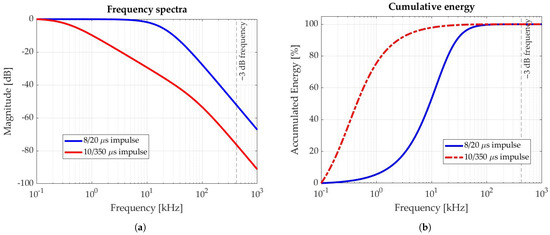 To illustrate this, Figure 2 presents a frequency-domain analysis of the 8/20 μs and 10/350 μs impulses—waveforms commonly used to represent indirect and direct lightning strikes, respectively. The analysis was performed using the double exponential model [34] to represent lightning strike current :