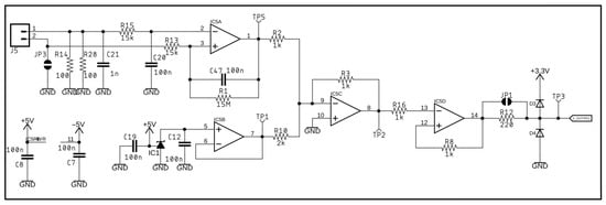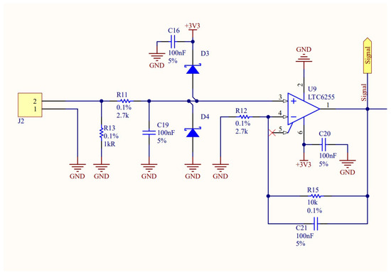 In this research, an active integrator configuration was used [36]. The circuit consists of an operational amplifier with a capacitor and a resistor connected in parallel in the feedback loop, forming a negative feedback network. A resistor is connected between the inverting input and ground. The voltage signal from the Rogowski coil is applied to the non-inverting input of the operational amplifier, and the output provides the integrated voltage, which is directly proportional to the measured current. A detailed schematic of the implemented integrator circuit is presented in Figure 3. In addition to the integrator stage, the circuit includes additional capacitors for voltage regulation and voltage limiters to ensure stable and reliable operation.