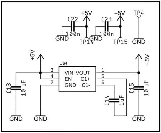 Figure 5, Figure 6 and Figure 7 present circuit diagrams of the main components of the impulse detector module, namely: the negative voltage source (Figure 5), the impulse detector (Figure 6), and the analog signal conditioning circuit (Figure 7).