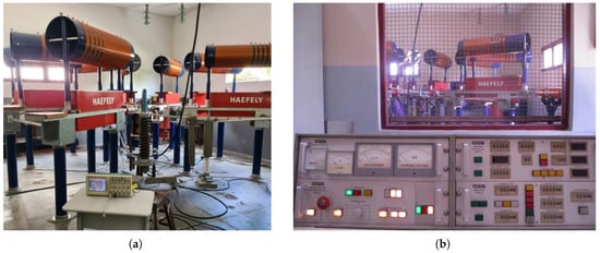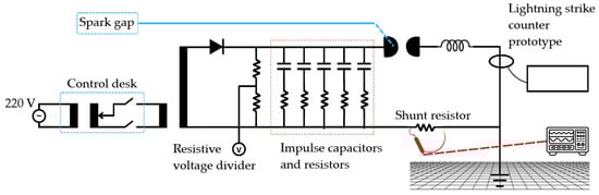 The ICG was used to produce current impulses representative of lightning strike currents for testing. In addition to the capacitors, the generator includes series resistors and an inductor to shape the waveform, with the current measured indirectly by a shunt resistor, as shown in Figure 10. In the tests, five 2.0 μF capacitors were used, each connected in series with a 5.0 resistor, and the inductance value was 5.7 μH. Illustrative photographs of the setup and control desk are shown in Figure 11.