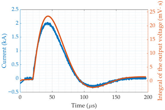 - Test of the Rogowski coil output: The current waveform measured using the IGC shunt resistor was compared with the current waveform obtained from the integration of the Rogowski coil output signal. The results demonstrated waveform alignment, differing only by a scaling factor related to the coil transformation ratio. To analytically assess the linearity of the coil-integrator system, the Pearson’s correlation coefficient [40] between the two signals was calculated, yielding r = 0.998. This high correlation confirms a strong linear relationship between the reference current waveform and the current derived from the Rogowski coil integration process. As an example, a comparison of the two waveforms is presented in Figure 12.