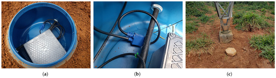 Figure 14 shows photographs of the installation process for one of the systems. Figure 14a depicts the lighting counter system housed inside its inspection box. The polymeric enclosure contains the circuit and the stationary battery, with a Rogowski coil cable as output. Figure 14b provides a closer view of how the coil is connected to the grounding cable. After installation, the inspection box was sealed with a hermetic lid to protect the system from water, humidity, and animals. Finally, a concrete block was placed over the lid to provide additional protection to the system, as shown in Figure 14c. This installation procedure was repeated for all nine towers equipped with lightning counters.