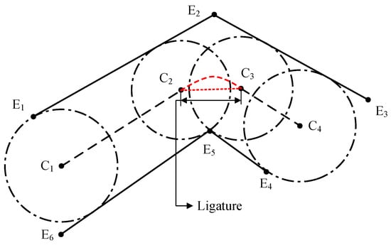 As is shown in Figure 1, a ligature starts and ends up with two primary MDs connected by a common extreme point . Between these two primary MDs, additional secondary MDs can be created with two constraint elements: the same extreme point , and a tangent line segment (for example, the line segment ).