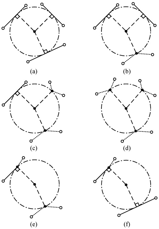 According to the number of segments and points constraining the MD, four basic cases can be identified, shown as Figure 2a–d. In these basic cases, the segments and the points constraining the MD are not related, but there are also two special cases, shown as Figure 2e,f, where one of the constraining points lies on one of the segments.