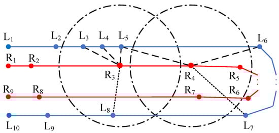 Due to the sparse distribution of the points, no opposite point may be found within the given circle in the range search. But a point pair does exist. An example can be seen in Figure 3 that no points are found in the circle centered at but an MD might exist with constraints of points and and their relevant segments. To avoid this omission, a nearest-neighbor search is performed after the range search to supplement its limitation on the search scope. All points on both borders are stored in the structure of a 2-dimensional tree [53] for easy and quick point query. The number of nearest neighbors is set to 3 to ensure correct and efficient point pairing. And the same point filtering method as used in range search in this section is used to remove points failing to constrain an in-lane MD.