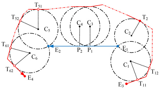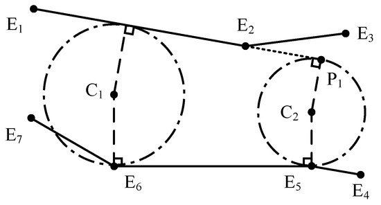 At the beginning of the connecting process, the MDs are sorted according to the contact points on a chosen border, based on the border-along distance between the contact point and the start point of the border. For example, in Figure 5, comes earlier than because its contact point is closer to , the start point of the segment, than .
