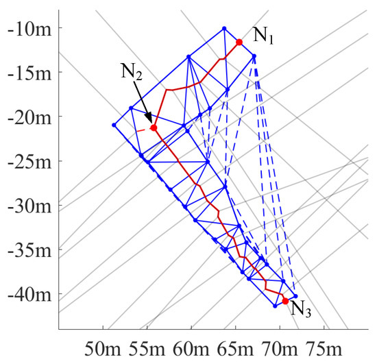 Lane polygons are usually nonconvex and, as a result, Delaunay triangulation will be performed both inside the lane polygon and in its concavity, as shown by the dashed blue triangles Figure 6. These triangles should be removed because they do not belong to the lane region. The result of this operation is shown in Figure 6 by the solid blue lines.