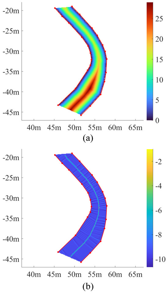 A distance map is then calculated from the binary map, by propagating the distance from the boundary to the neighboring cells, across the whole map [42]. The metric of 8-neighbor Euclidean Distance is used to provide a smooth variation of the distance value. To reduce the computational load, the DT is restricted inside the lane polygon with a created in-lane discriminant matrix. Furthermore, the distance between two orthogonally adjacent cells is set to 1 instead of the resolution of the grid map. This means that the intensity of the ridge in the ridge detection will not change with the resolution. The resulting distance map is shown in Figure 7a. The colored area is the area of interest, and the different colors represent the distance values derived from DT.