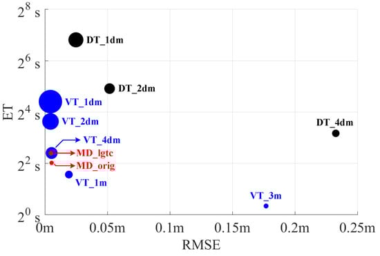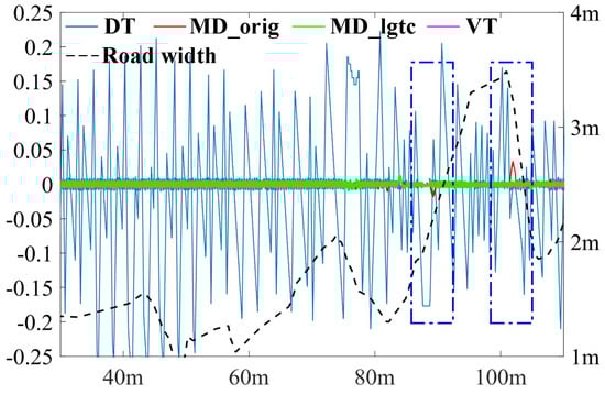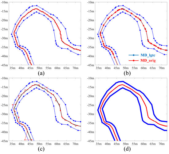 To provide a comprehensive analysis, two alternative methods are explored based on the VT and DT techniques. In centerline extraction applications, the VT method is particularly advantageous for its high time efficiency, especially when dealing with low-resolution border points, and it ensures accurate estimations in scenarios of high spatial density. On the other hand, DT-based solutions are well applied when objects are represented in polygonal forms, such as lanes in our case. They offer extremely accurate estimation of centerlines at high resolutions, making them suitable for providing ground truth in comparative analysis within this research. Both methods have demonstrated their efficacy in a variety of centerline extraction tasks across different domains, including medical imaging, road morphology and biometric identification [49,50,51,52]. Their proven effectiveness in centerline extraction justifies their selection for comparison with our proposed MD-based method.
