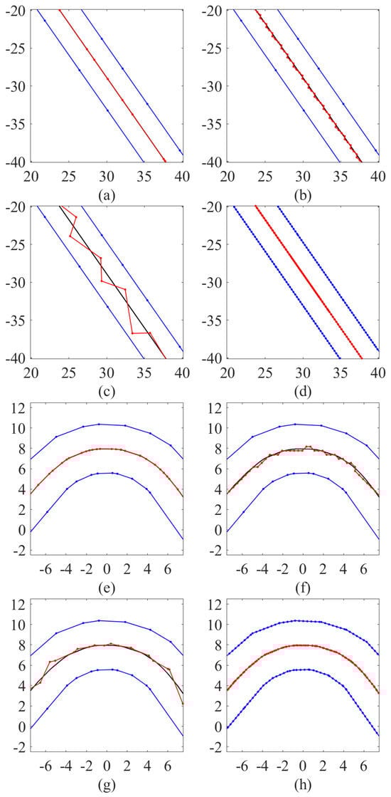 Of all the six cases, Figure 2f is the most common one in road scenarios, as it is characteristic of the beginning of a new lane piece with a slight bend. The other cases are related to special configurations of the road boundaries, including sharp bends, and road bottlenecks. Since the coordinates of all border points are known, the formulation of the line segments could be given in the standard form: