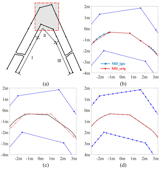 Some of these identified points are unsuitable for matching, because belonging to a section of the border that is unreachable by an MD. This situation is common in a U-type lane, as shown in Figure 3. An in-lane MD could not be found under the constraints of and or their relevant line segments. So should not be matched with the selected extreme point . To remove these unwanted points like , accumulated distances along the border are considered as the point filtering criteria. The circle points inside the search range are first grouped by their indexes, in which the point indexes are numerically continuous and increase from the lane start to the end in sequence. For example, -relevant points will be divided into two groups, one containing , and and the other containing only. Then, the group of points with smaller indexes will be chosen if the accumulated distance of the selected extreme point to the start is smaller than its distance to the end; otherwise, the group of points with bigger indexes will retain. As Figure 3 shows, the extreme point is closer to the start point and the group containing , having a larger index, is discarded.