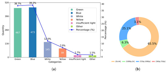 LHUI data analysis. (a) The diversity of LHUI samples includes six types of color degradation and their respective proportions. (b) The resolution distribution of LHUI.